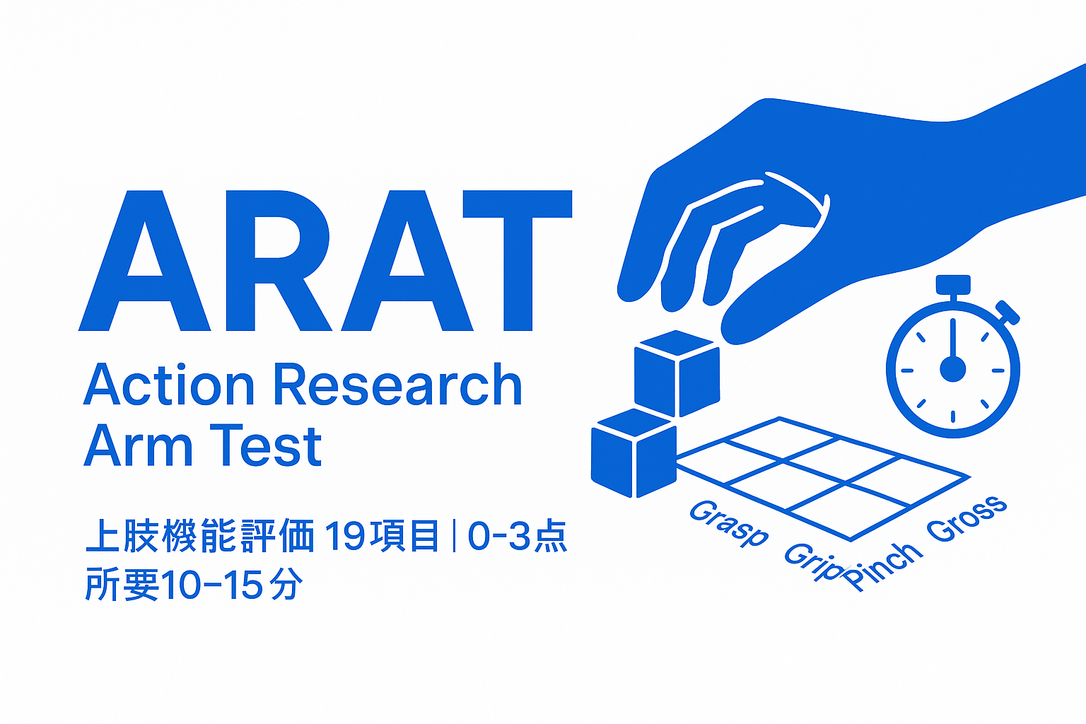 評価 ARAT(上肢機能テスト)実施と採点 脳卒中後の上肢機能を評価する ARAT の実施手順と採点(0–3 点)、ショートカット規則、所要時間、解釈、よくあるミスを理学療法士・作業療法士向けに解説。A4 スコアシート付き。 2025.10.16 評価
