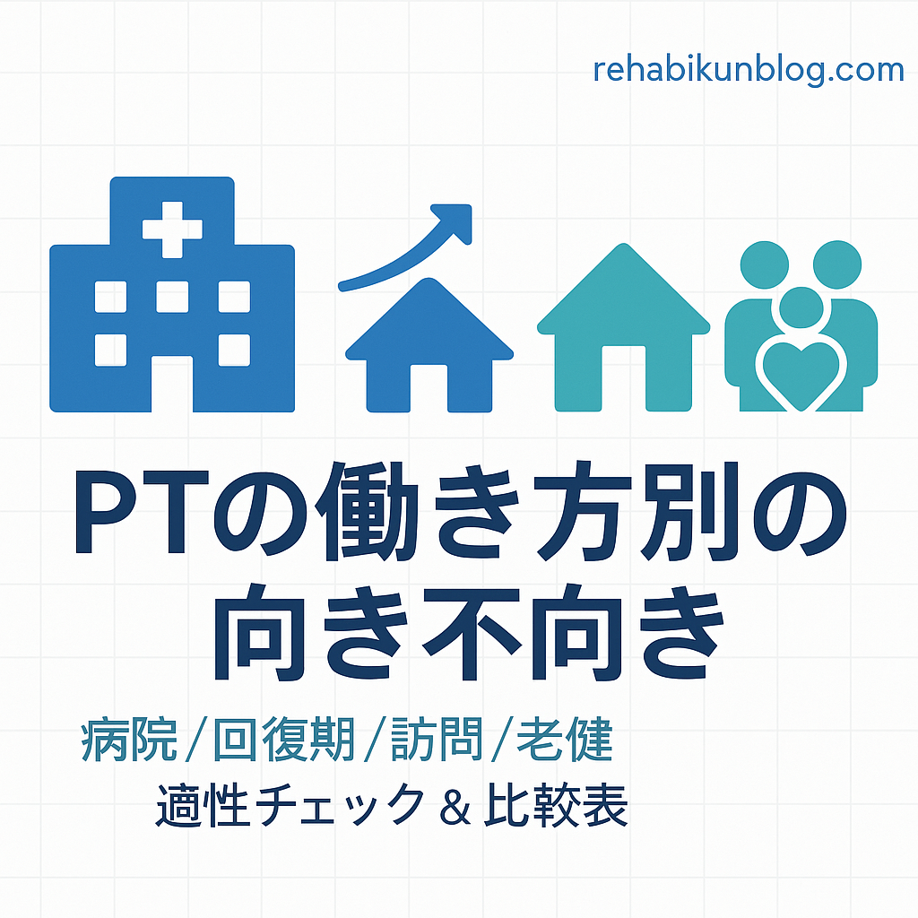 キャリア PTの働き方別の向き不向き【病院/施設/訪問】 理学療法士の働き方を病院/施設/訪問の大分類と、病院(急性/回復/慢性)・施設(老健/特養/デイ)の細分類で比較。YES/NO判定表と、見学・面談チェックリスト付き。 2025.10.15 キャリア