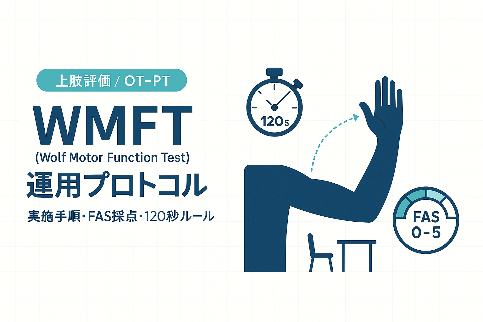 評価 WMFT 運用プロトコル|実施手順と採点のコツ WMFT の実施手順をわかりやすく整理。セットアップ、FAS 0–5 の採点、120秒上限と記録法、よくあるミス、A4スコアシートの埋め込みまで。初めてでも臨床で再現できるプロトコル。 2025.10.17 評価