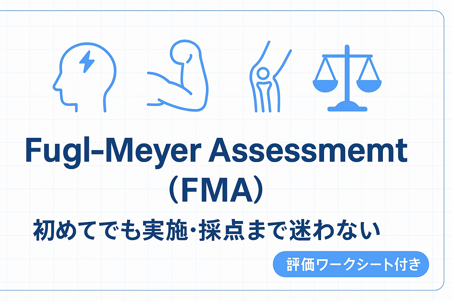 評価 Fugl-Meyer Assessment(FMA)の実施手順 脳卒中後の感覚運動障害を定量化する Fugl-Meyer Assessment(FMA)の実施手順と採点基準を、初めての方でも迷わないように解説。上肢 66 点・下肢 34 点の運動項目に加え、感覚・バランス・関節可動域/疼痛、所要時間、MCID の目安、よくあるミスと中止基準まで網羅。 2025.10.14 評価