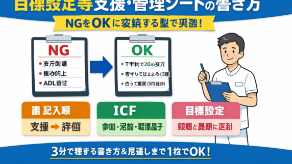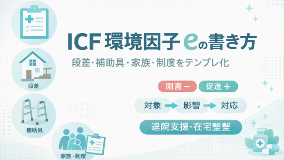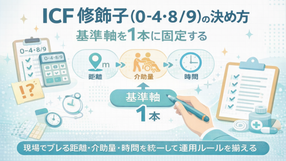 ICF 修飾子 0–4 と 8 / 9 を、距離・介助量・時間の「基準軸」で統一する実務ガイド。Performance / Capacity の使い分け、よくある失敗と記録テンプレも収録。
