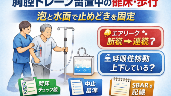 臨床手技・プロトコル 胸腔ドレーン留置中の離床・歩行|泡と水面で止めどき固定 胸腔ドレーン留置中の離床は「泡(エアリーク)」「呼吸性移動」「症状+バイタル」の 3 点で止めどきを固定。チェック表・中止基準・SBAR・記録テンプレを掲載。 2026.02.21 臨床手技・プロトコル
