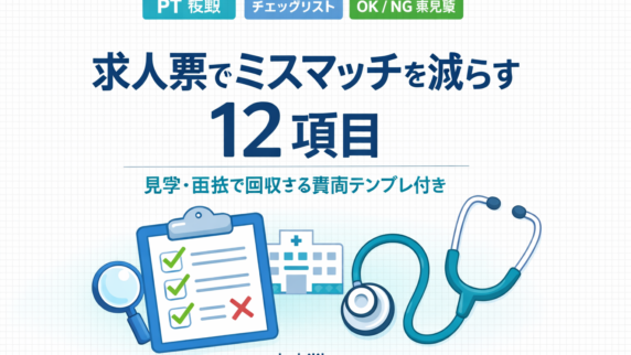 キャリア 理学療法士の求人票でミスマッチを減らす 12 項目【面接で回収】 PT の転職ミスマッチは「給与」より運用差で起きます。求人票で見落とす 12 項目を OK/NG 早見表と質問テンプレで整理。見学・面接で回収できます。 2026.02.21 キャリア
