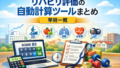 評価 リハビリ評価の自動計算ツールまとめ リハビリで使える自動計算ツールを一覧で整理。ADL・IADL、栄養、呼吸、活動量などの計算系コンテンツを、用途別に対応記事から探せます。 2026.03.20 評価