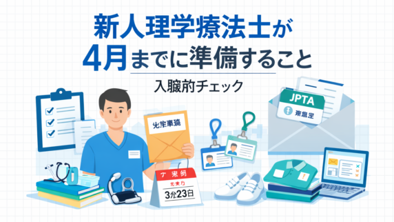 キャリア 新人理学療法士が 4 月までに準備すること|入職前チェック 新人理学療法士が 4 月までに準備したいことを整理。合格発表後にやること、入職前に確認したい持ち物・学習・手続き、JPTA・士会まわりの初動をわかりやすく解説します。 2026.03.08 キャリア