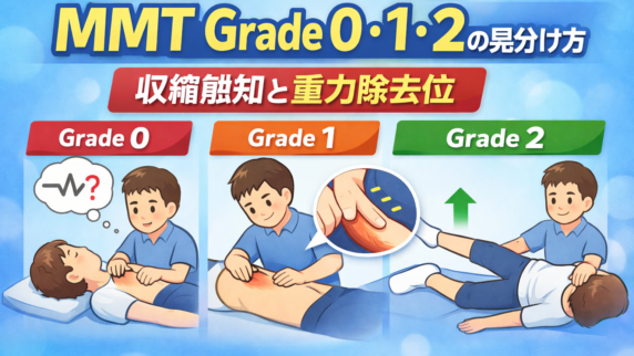 評価 MMT Grade 0・1・2 の見分け方|収縮触知と重力除去位 MMT の Grade 0・1・2 の違いを、収縮触知・重力除去位・誤判定しやすい場面で整理します。新人 PT が迷いやすい低グレード帯を、記載例つきで実務向けに解説します。 2026.03.28 評価