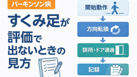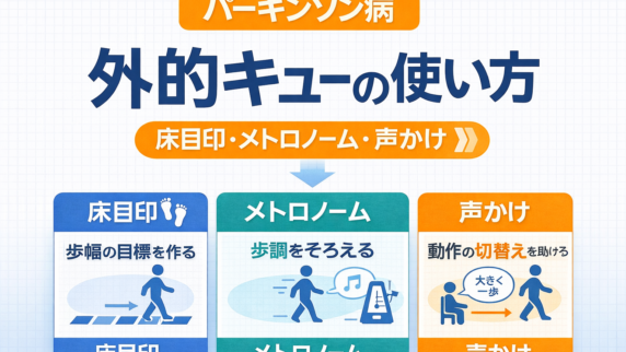 疾患別 パーキンソン病の外的キューの使い方 パーキンソン病の外的キューを、床目印・メトロノーム・声かけに分けて整理します。合いやすい場面、効きにくいときの見直し方、記録の残し方まで PT 向けにまとめました。 2026.04.05 疾患別