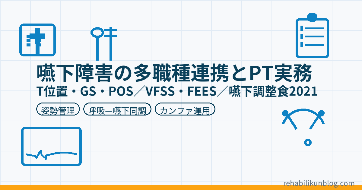 評価は「観察→スクリーン→(必要時)VFSS/FEES→方針→再評価」の反復です。PT は姿勢・呼吸—嚥下同調、頸部機能を整え、T位置(形態)×GS(機能)で介入優先度を決めます。