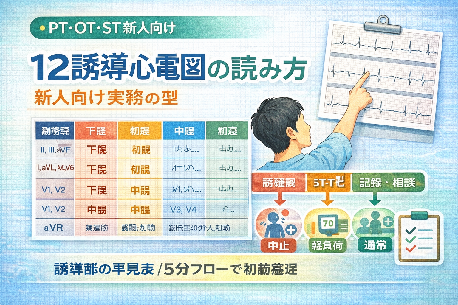 12 誘導心電図の新人教育でつまずきやすいのは、誘導の位置関係を覚えても、当日介入の判断に結びつかないことです。PT・OT・ST の実務では、診断名を断定することよりも、危険サインを見逃さず、安全に実施可否を決めて相談へつなぐことが重要です。本記事は、そのための最小運用を整理します。