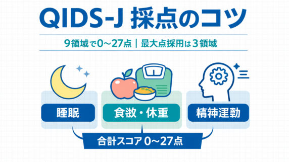 QIDS-J の採点( 9 領域・ 0〜27 点)を 5 分で確認し、記録を統一します。記録シート PDF(A4)を埋め込み、最大点採用 3 領域の注意点、重症度の目安、採点ミスの防ぎ方、再評価の間隔をまとめました。