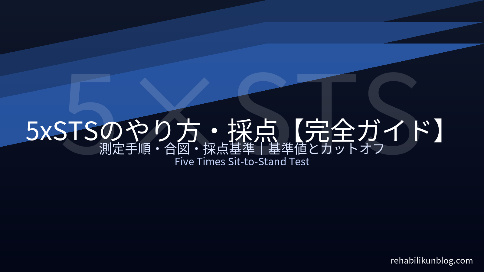 - 計測:合図「ゴー」で開始、5回目で臀部が座面に触れた瞬間に停止。 [oai_citation:5‡Shirley Ryan AbilityLab](https://www.sralab.org/rehabilitation-measures/five-times-sit-stand-test)