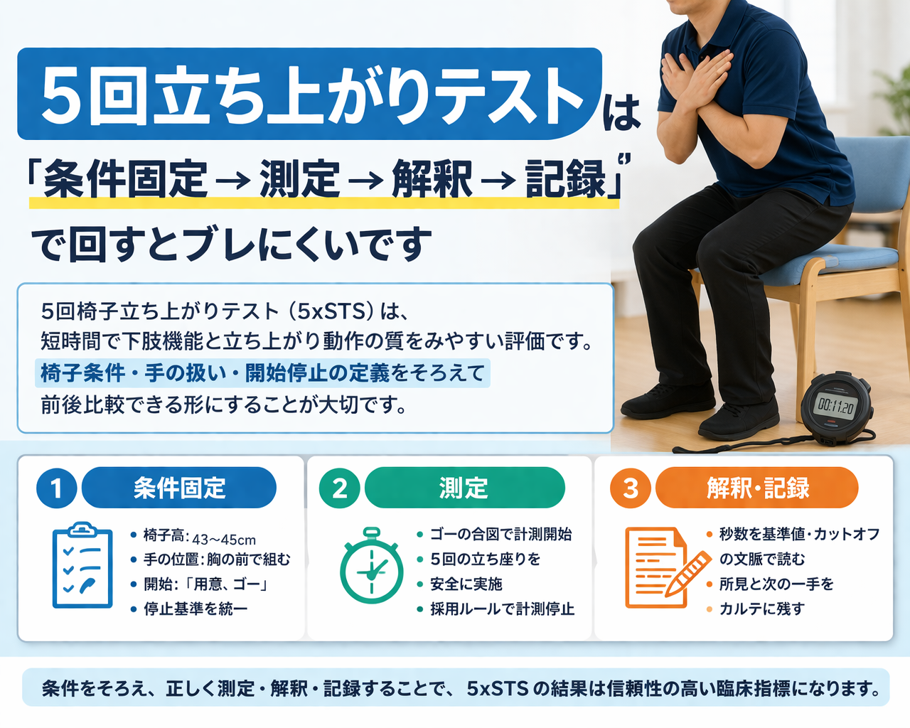 5 回立ち上がりテストは「条件固定 → 測定 → 解釈 → 記録」で回すとブレにくいです