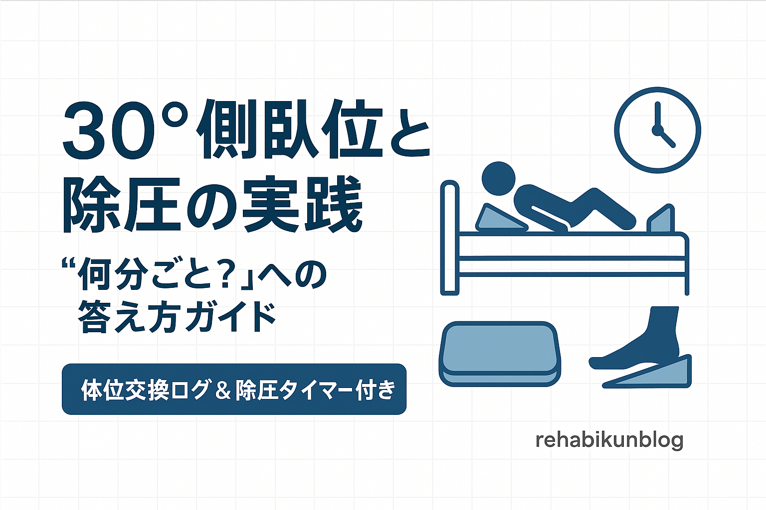 臨床手技・プロトコル 30°側臥位と体位交換の間隔|褥瘡予防の実践 30°側臥位の根拠と体位交換の“何時間ごと?”への答え方を、最新ガイドラインに基づき条件別フローで解説。ログとタイマー運用メモ付き。 2025.10.21 臨床手技・プロトコル