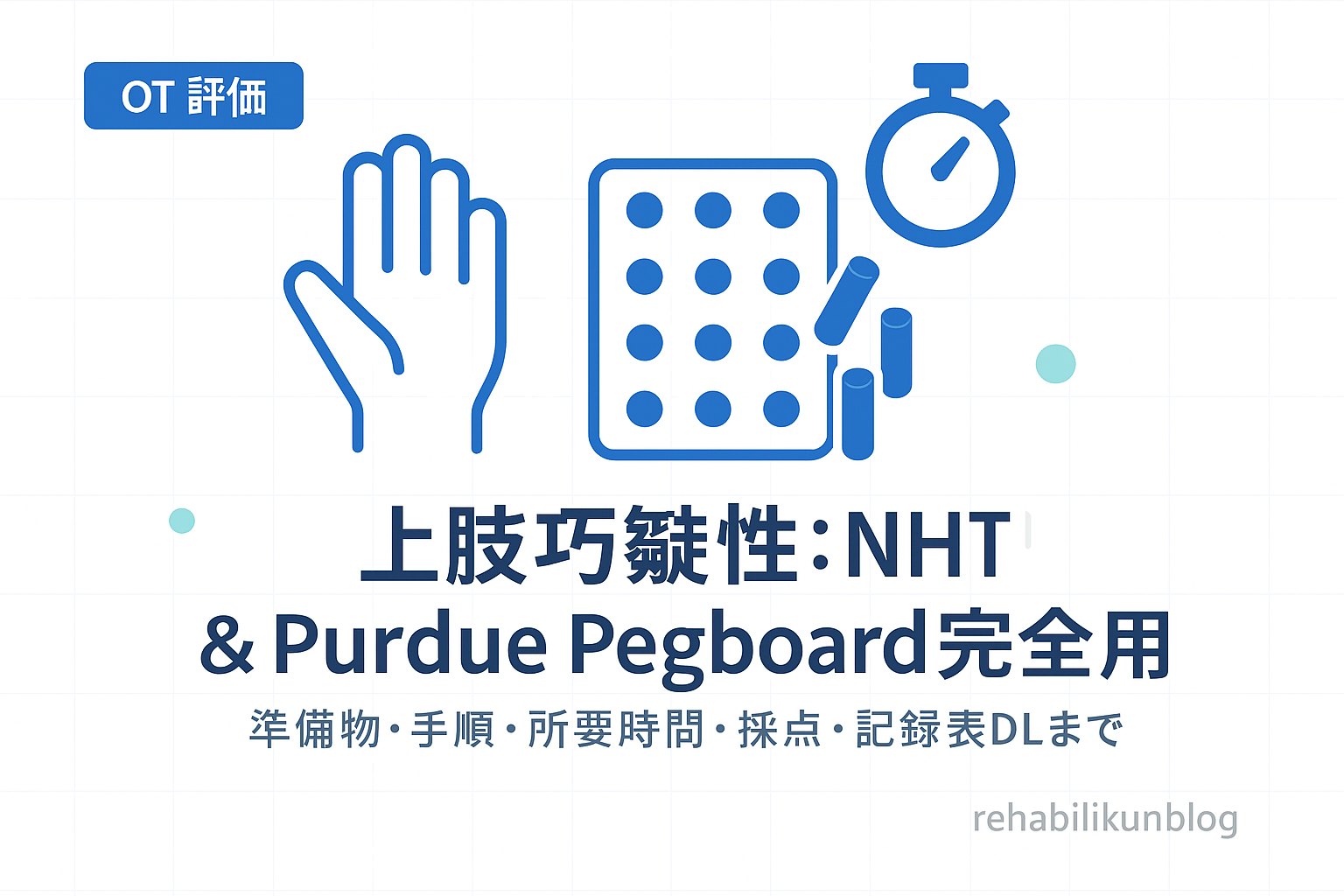 評価 上肢巧緻性の評価|NHPT&Purdueを“最短で”実装 Nine-Hole Peg Test と Purdue Pegboard を日本語で完全解説。準備物・手順・所要時間・採点・記録表DL・臨床のコツまで、OT向け実務ガイドです。 2025.10.20 評価