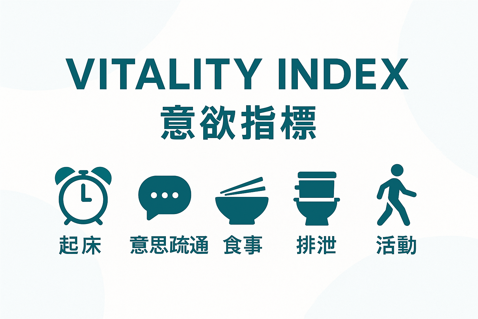 評価 Vitality Index(意欲指標)の評価方法と活用 Vitality Index の実施手順と採点(5項目×3件法)、7点以下の目安、観察の基準化や再評価の頻度、誤用対策を解説。項目本文なしの記録用シートあり。 2025.10.22 評価