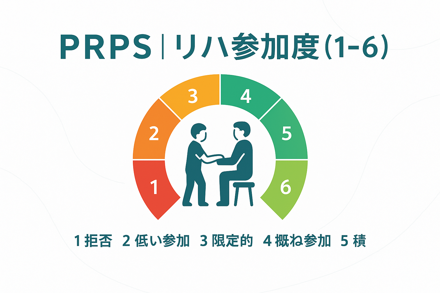 評価 PRPS(ピッツバーグ・リハ参加)6段階評価の使い方 PRPSの6段階評定でリハ参加態度を数値化。実施基準、推移の追い方、誤用対策、セッション記録への落とし込みを解説。項目本文なしの記録用シートあり。 2025.10.22 評価