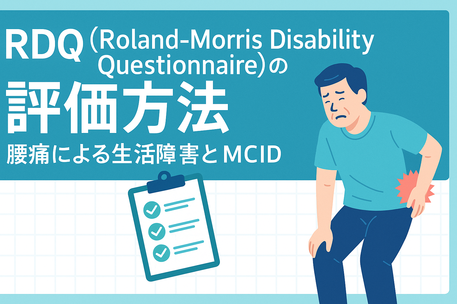 RDQ(Roland-Morris Disability Questionnaire)は腰痛による生活障害を 24 項目で評価する質問票です。構成と採点方法、スコアの解釈、基準値と MCID、ODI など他スケールとの使い分け、外来・回復期・在宅での活用例を理学療法士向けに整理します。