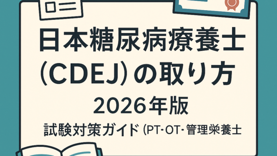 日本糖尿病療養指導士(CDEJ)を2026年に受験したい医療職向けに、受験資格(5職種+実務要件)、症例記録10例の準備、CBT80問120分の試験概要、糖尿病療養指導ガイドブックを使った勉強ロードマップ、PT・OT・管理栄養士が現場でどう活かせるかを整理します。