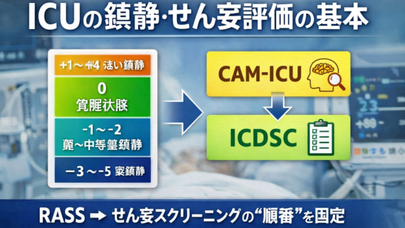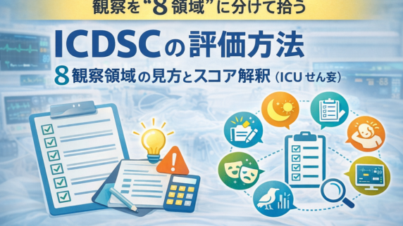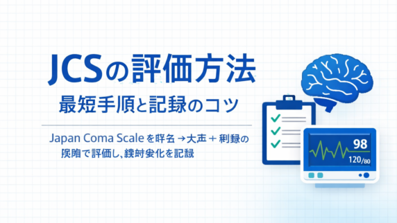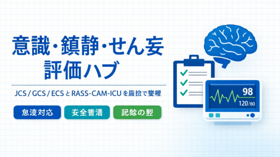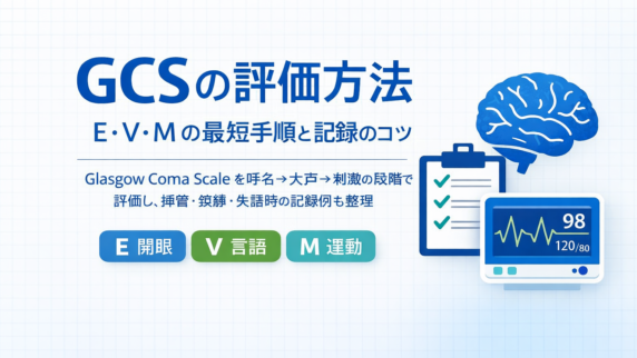GCS(E/V/M)の評価手順を呼名→大声→刺激の段階で標準化。合計点ではなく内訳を残し、挿管・鎮静・失語で評価不能な場合の記録例も整理します。