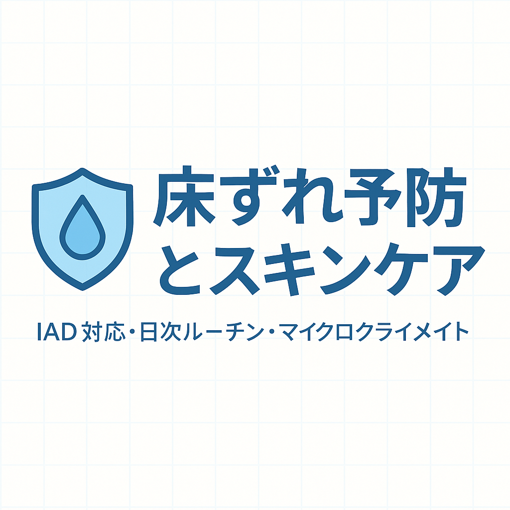 ガイドライン準拠のスキンケアで褥瘡を予防。pHバランス洗浄・1日2回の保湿・バリア材・IADアルゴ・マイクロクライメイト管理を、日々のルーチンと配布物で実装。