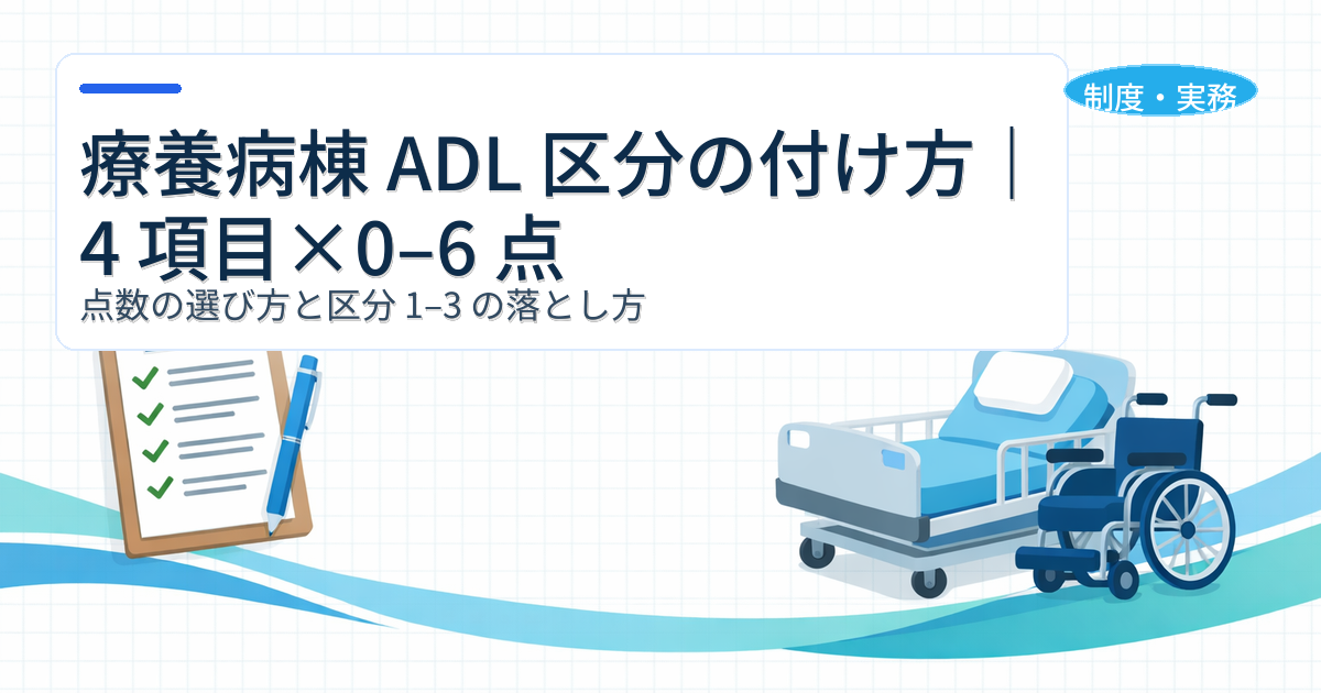 医療区分・ADL 区分の全体像(親記事)も合わせて整えると、評価→記録→請求までの迷いが減ります:医療区分・ADL 区分(療養病棟)まとめ
