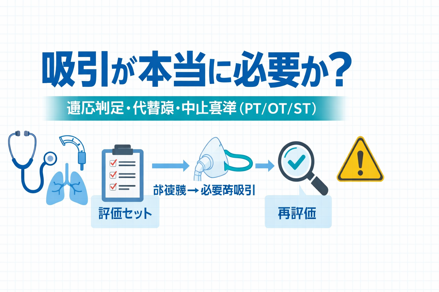 本ページは「吸引が必要かどうか」を評価で決めることに特化します。判定 → 非侵襲的代替 →(必要時のみ)吸引 → 再評価のループを明確化し、口腔・鼻腔・人工気道の具体手技には踏み込みません(手技総論は親記事に集約)。