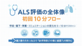 ALS の評価は領域が広いので、まずは全体の “順番” を固定すると判断が速くなります。評価の全体像(初回 10 分 → 優先順位 → 領域別)を先に整理したい場合は、ALS リハ評価の全体像(総論)から読むと迷いが減ります。
