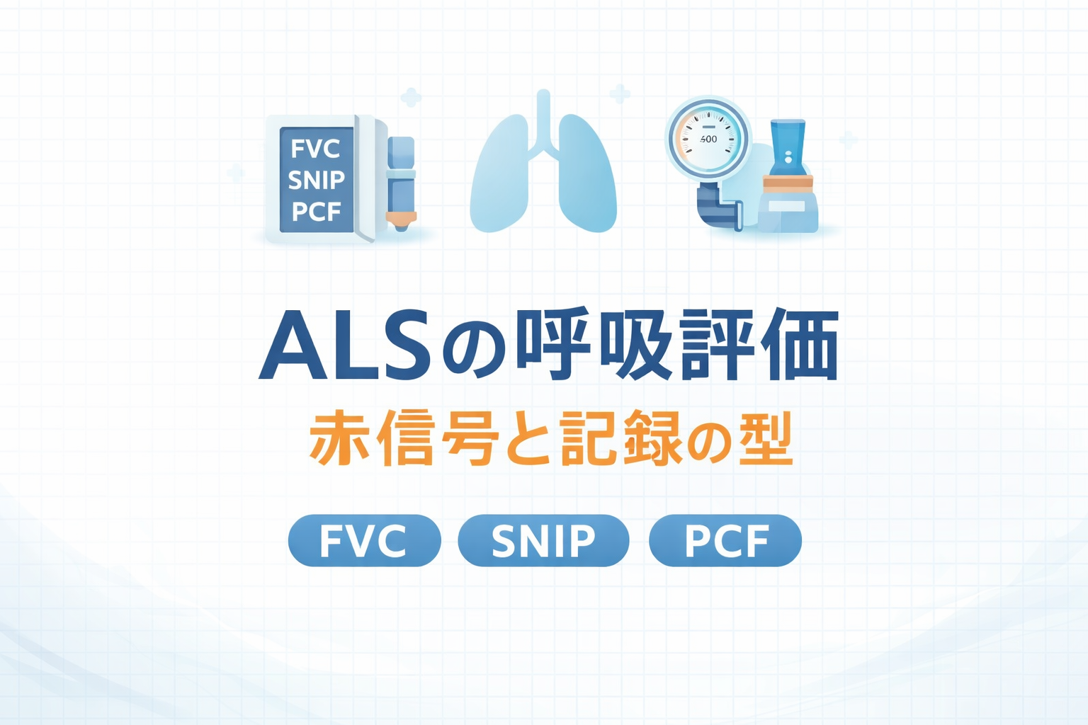 ALS の呼吸評価は、症状 → 簡易指標 → 測定の順に積み上げると、判断がブレません。ここでは現場で頻用される代表的な項目をまとめます。