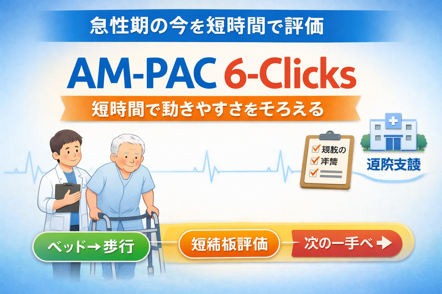 | AM-PAC 6-Clicks | 急性期の機能共有と退院支援 | 初回評価、病棟共有、退院先の検討 | 短時間でそろえやすい | 点数だけだと条件差が抜けやすい |