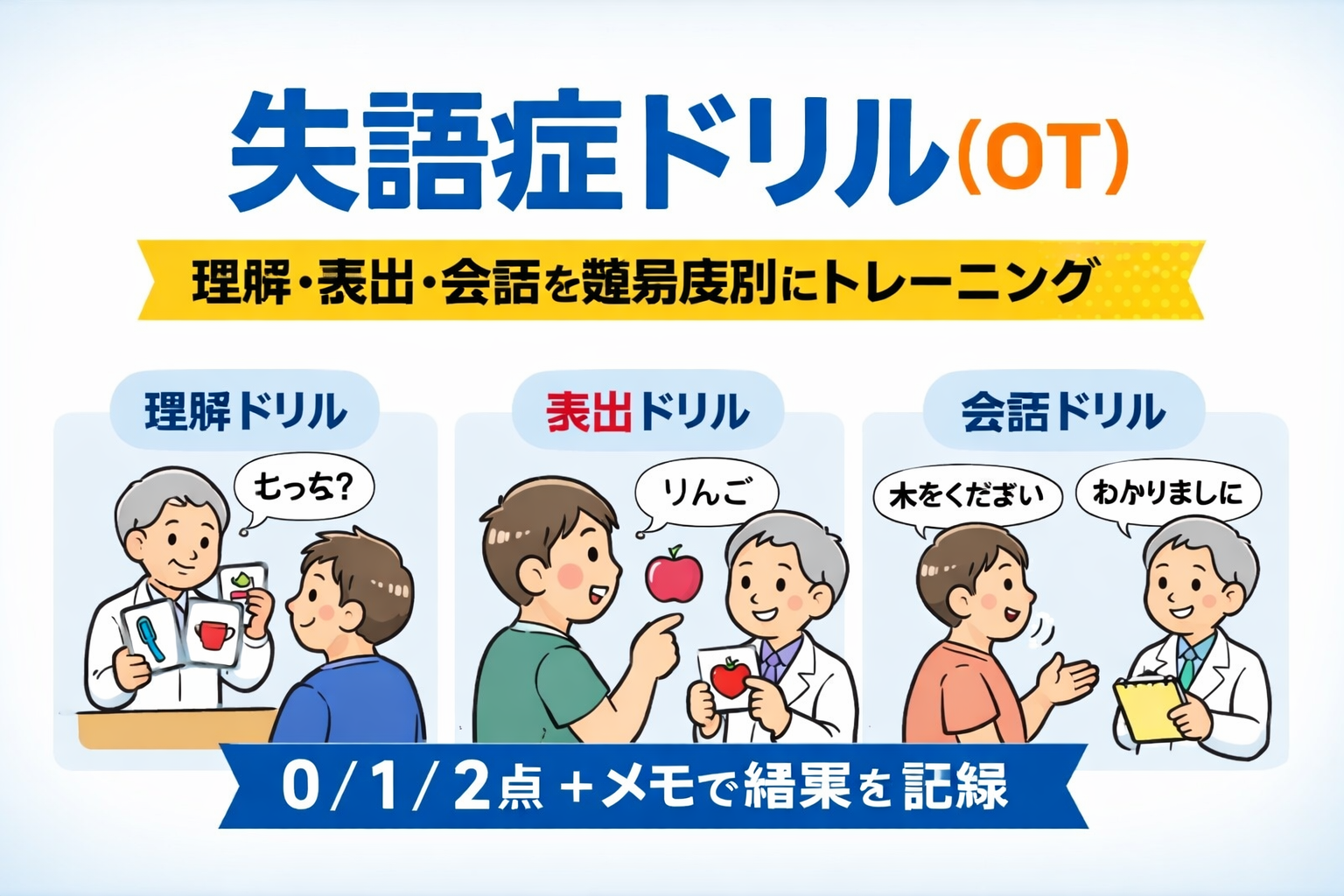失語症の練習は、課題を増やすほど迷いやすく、「結局その場で頑張っただけ」で終わりがちです。そこで本記事は、OT が現場で回せるように理解(聴理解)・表出(呼称/発話)・会話を難易度別に整理し、実施ルールと記録(0/1/2 点)まで 1 セットでまとめます。