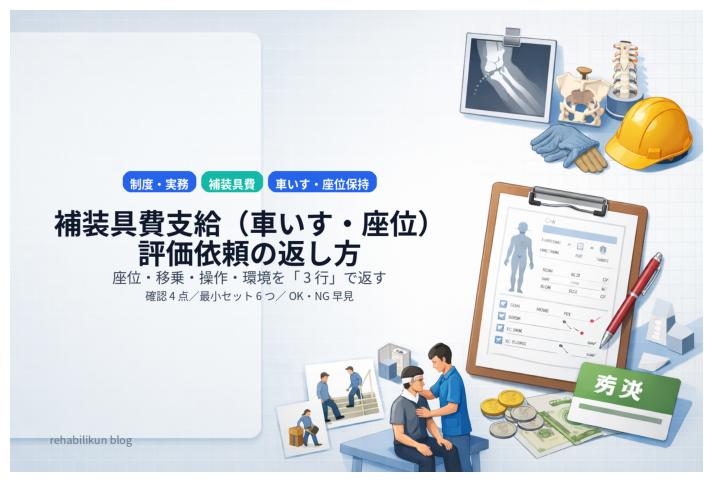 ポイントは、評価を「測って終わり」にしないことです。様式(自治体)/時点/使用環境/条件(装具・クッション等)をそろえて返すと、書類作成側の手戻りが減り、あなたの所見が“支給判断に使える情報”になります。関連の総論は 書類作成のための評価依頼(総論) にまとめています。