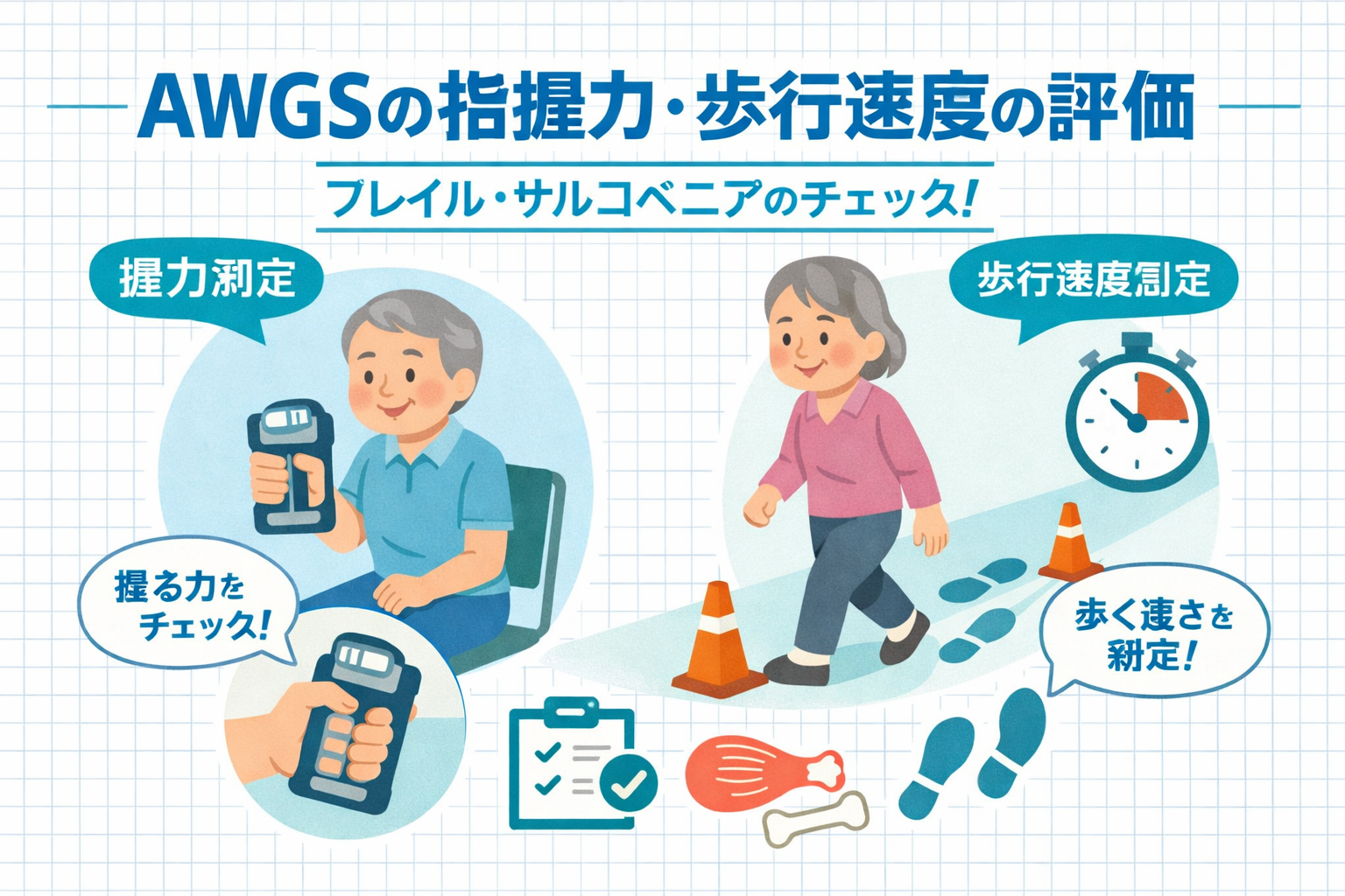 握力と歩行速度は、サルコペニア評価の入口で使いやすい指標です。この記事では AWGS 2019 を参照する現場向けに、握力・歩行速度の測り方、カットオフ、記録の型 を 1 ページで確認できる形に整理します。病棟・外来・通所で「どう測ればブレにくいか」「どこまで書けば共有しやすいか」を先にそろえる構成です。