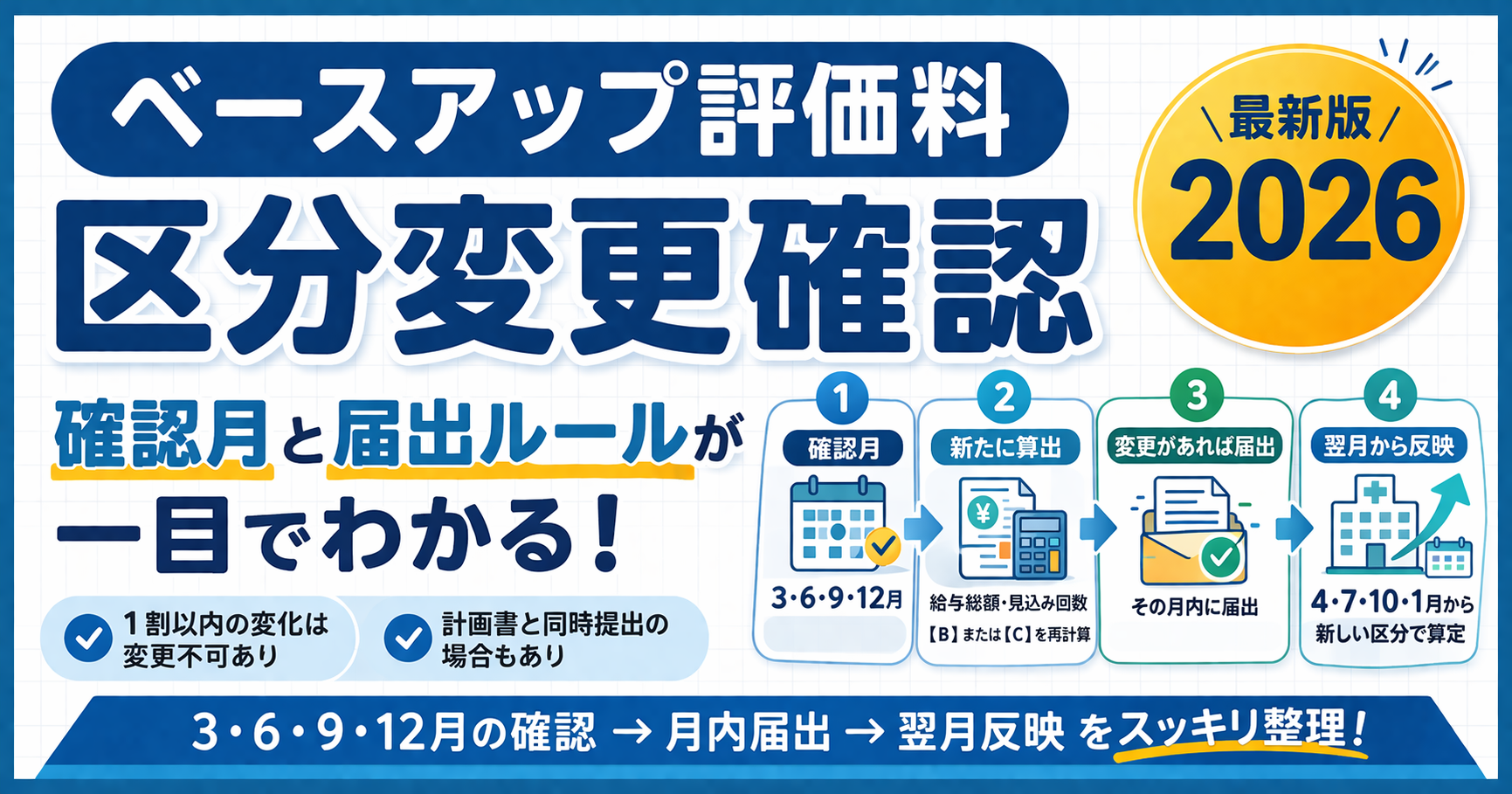 続けて読むなら、ベースアップ評価料(Ⅱ)の区分計算 2026|賃金改善算定基礎額・区分決定・注意点で、区分変更確認の土台になる計算式を先に確認すると整理しやすくなります。