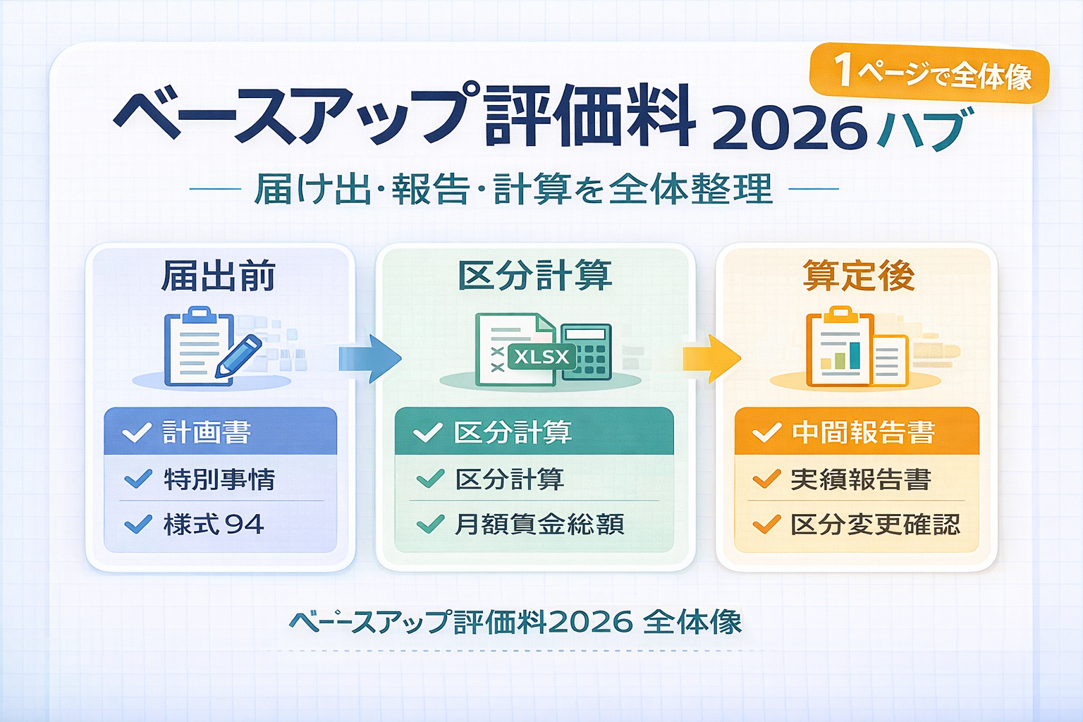 このページは、ベースアップ評価料 2026 の情報を1 本にまとめた親ハブです。検索で知りたいのは「制度の名称」よりも、まず何を読むべきか / どの書類が入口なのか / 区分計算で何を集めるのか / 算定後に何を出すのか / 例外ケースはどこを見ればよいのかであることが多く、そこを最短でたどれるように整理しています。