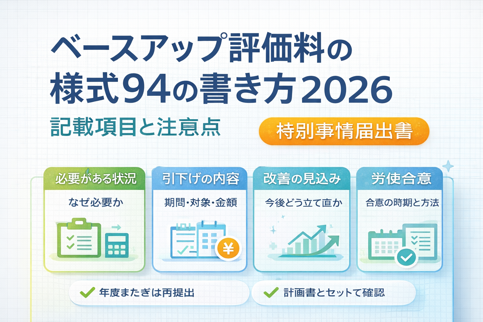続けて読むなら、ベースアップ評価料の特別事情届出書2026|必要な場面・書き方・注意点で要否判断を確認してから、このページに戻ると整理しやすくなります。