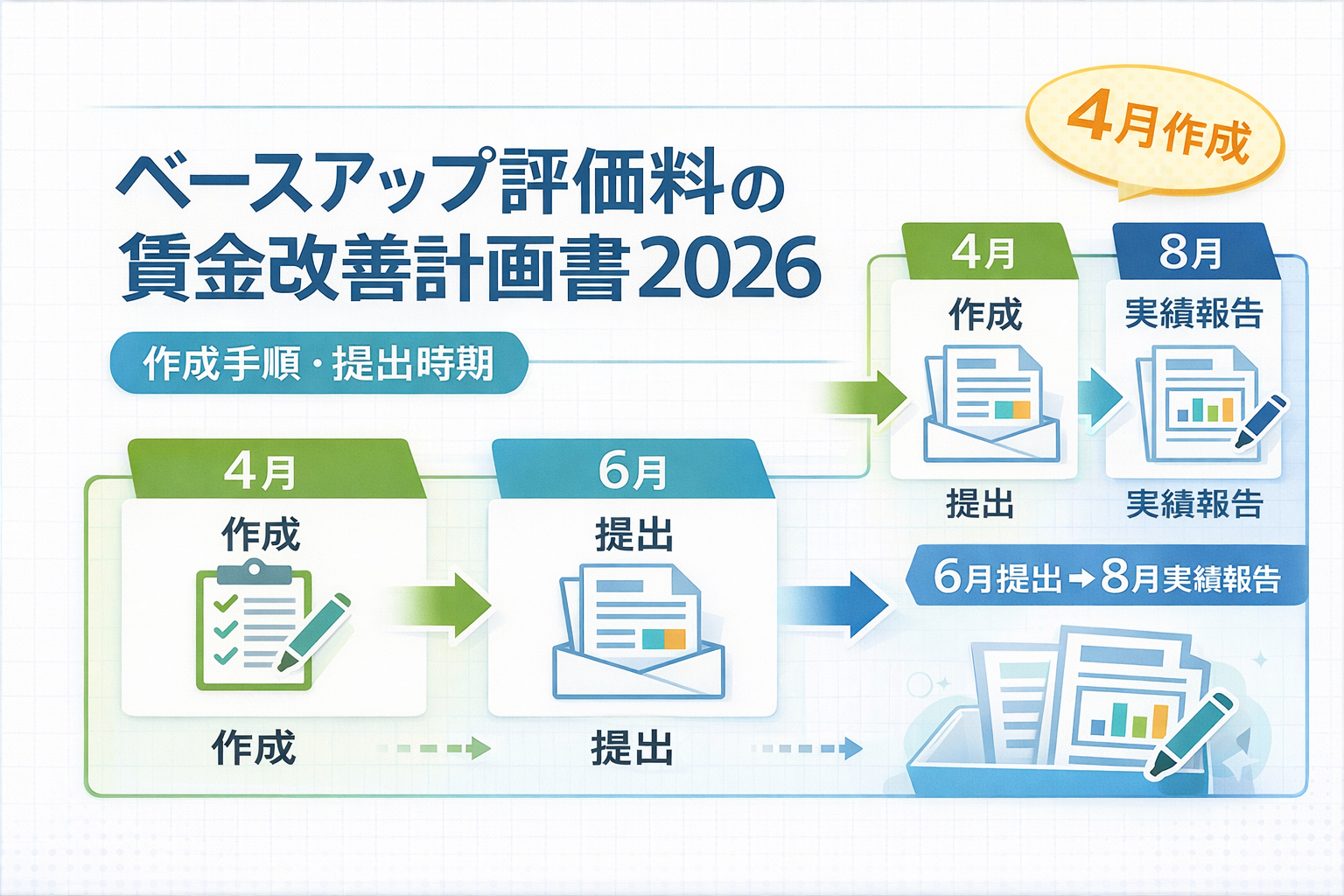 このテーマでいちばん大事なのは、賃金改善計画書は毎年 4 月に作成し、6 月に届け出ることです。地方厚生局の案内ではこの流れが明示されており、届出受理後の報告等として毎年 6 月に賃金改善計画書毎年 8 月に賃金改善実績報告書を提出する必要があると整理されています。
