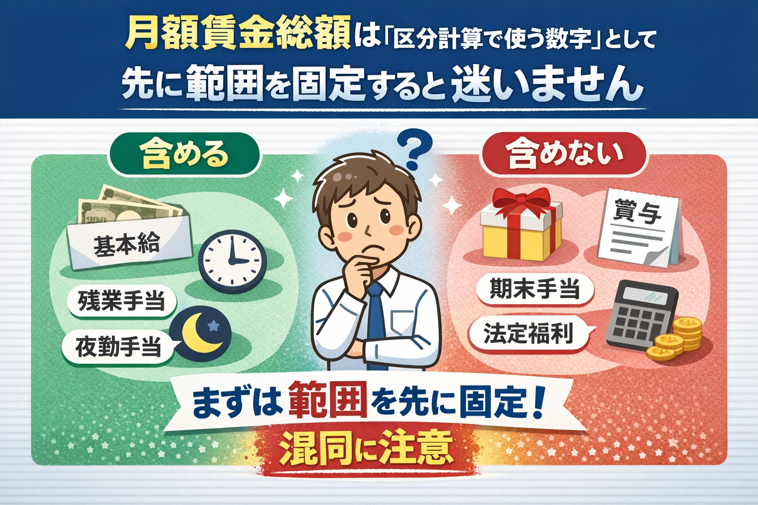 公開済みの関連記事が「区分計算の全体像」を扱うのに対して、本ページは月額賃金総額そのものの範囲だけに絞った補助記事を担当します。まずは定義を押さえ、その後に含める範囲、含めない範囲、夜勤手当の扱い、確認期間、提出前チェックへ進む流れで読むとズレません。