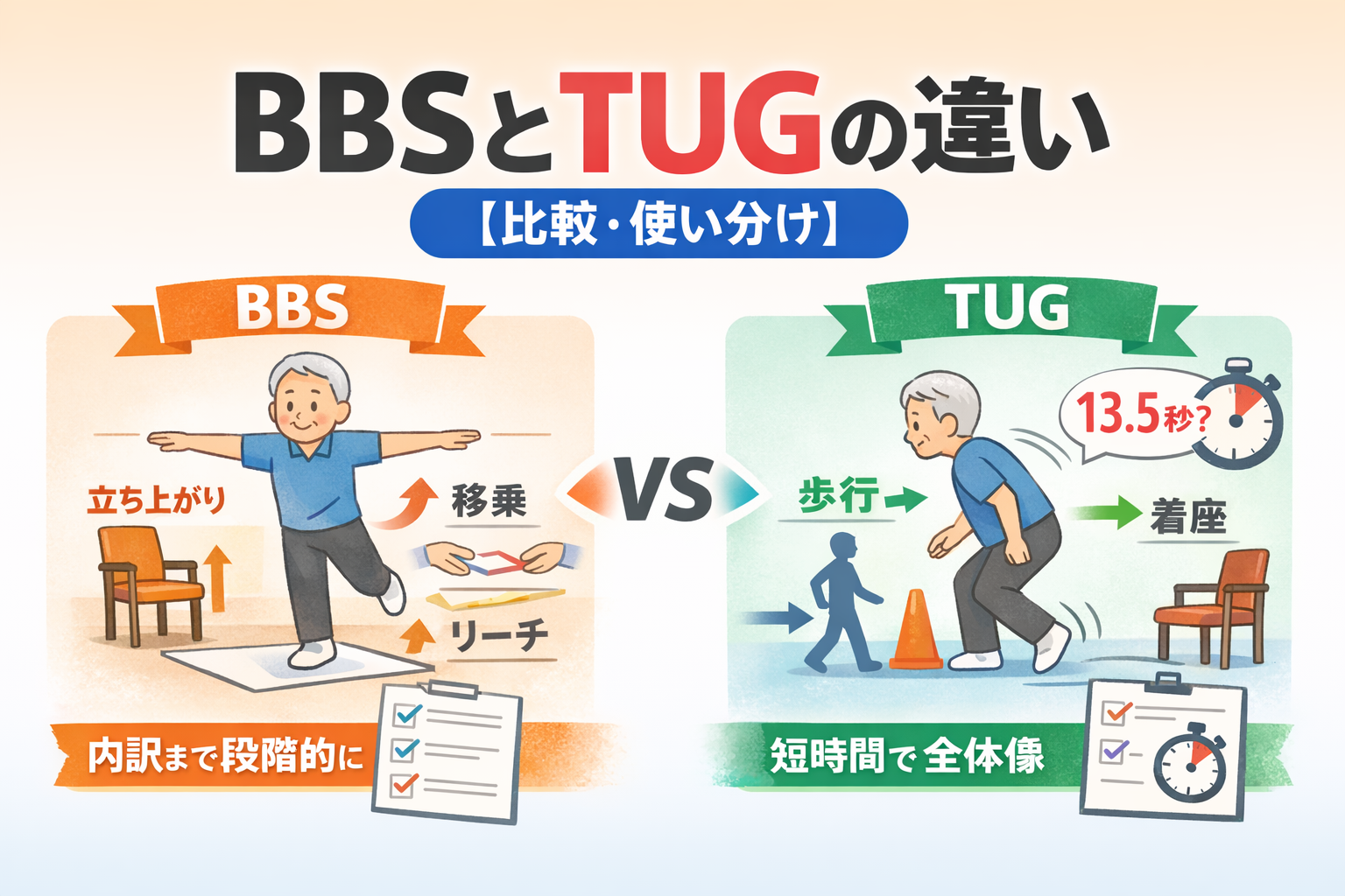このページで答えるのは、BBS と TUG の違い、どちらを先に使うか、代表的な目安をどう実務で扱うかです。細かな採点基準や声かけ文例を広げすぎず、比較で迷わないための整理にしぼってまとめます。