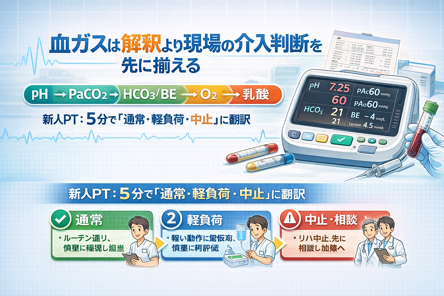このページは、血ガスを pH → PaCO2 → HCO3- / BE → 酸素化 → 乳酸 の順で拾い、通常 / 軽負荷 / 中止・相談へ翻訳する最小フローに絞って解説します。