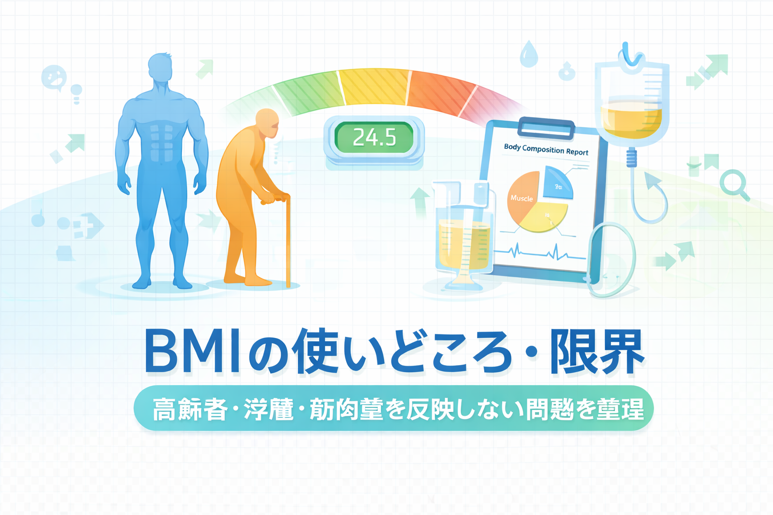 BMI は「体格」を一瞬で共有できる便利な指標ですが、筋肉量・浮腫・脱水・身長推定の誤差で簡単にブレます。臨床では、 BMI を結論にせず、体重推移・筋量の目安・機能指標とセットで解釈するのが安全です。