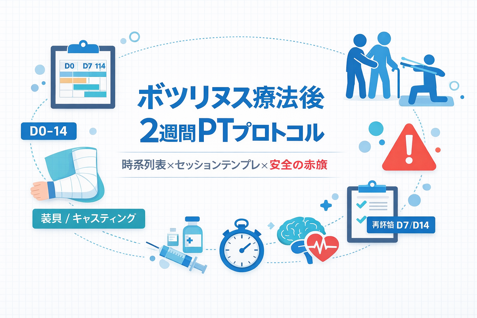 結論:ボツリヌス療法( BoNT-A )後の最初の 2 週間は、①時系列で優先順位を固定し、② 40–60 分のセッションをテンプレ化し、③再評価( D7 / D14 )を先に予定しておくと、効果の “ 取りこぼし ” を減らせます。発現〜ピークのタイムコースを踏まえ、伸びた可動域を機能へ転写する設計が要です。