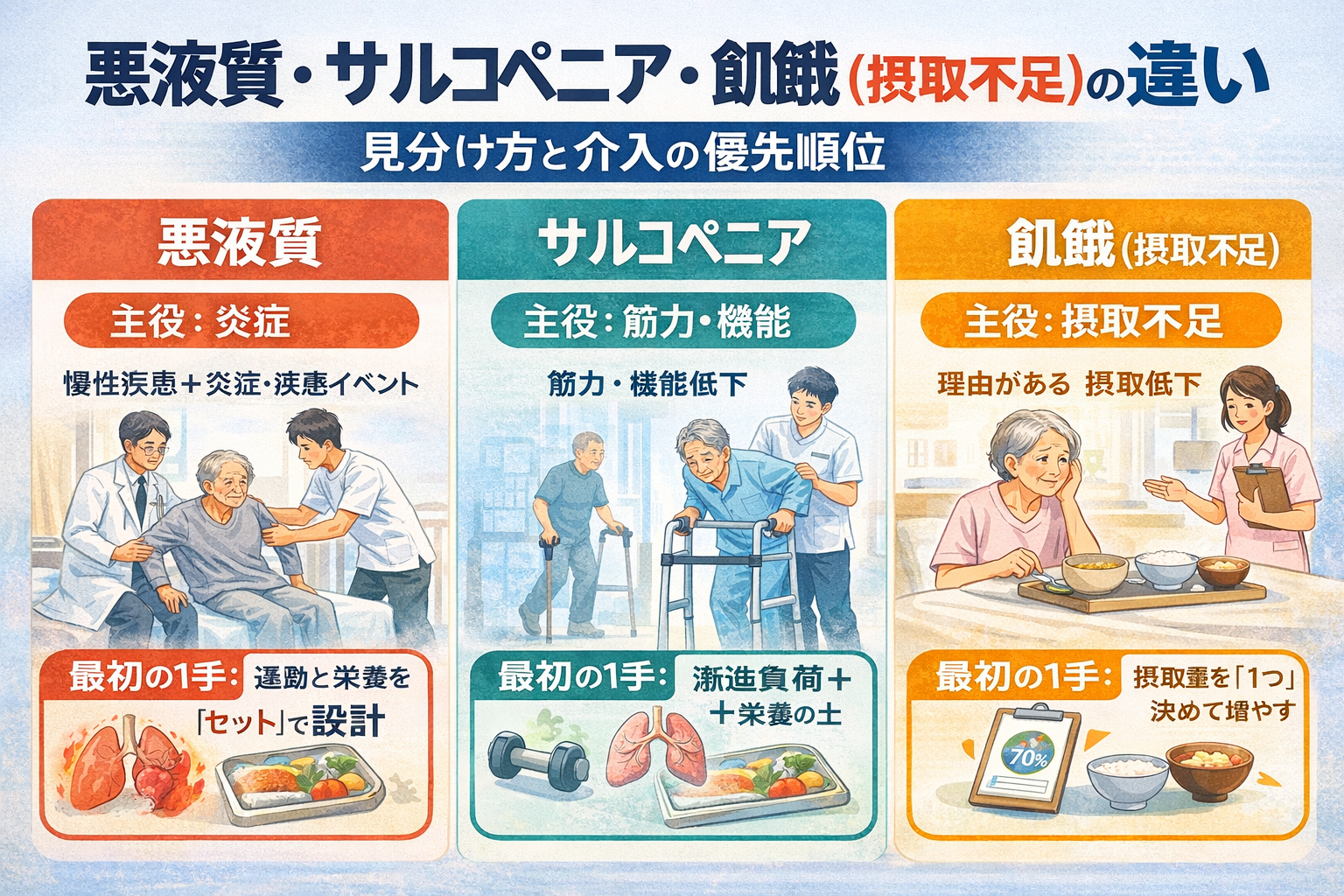 とくに、悪液質=炎症・疾患イベント、サルコペニア=筋力・機能低下、飢餓=摂取不足という整理を先に持っておくと、比較表や優先順位表の読み取りも速くなります。
