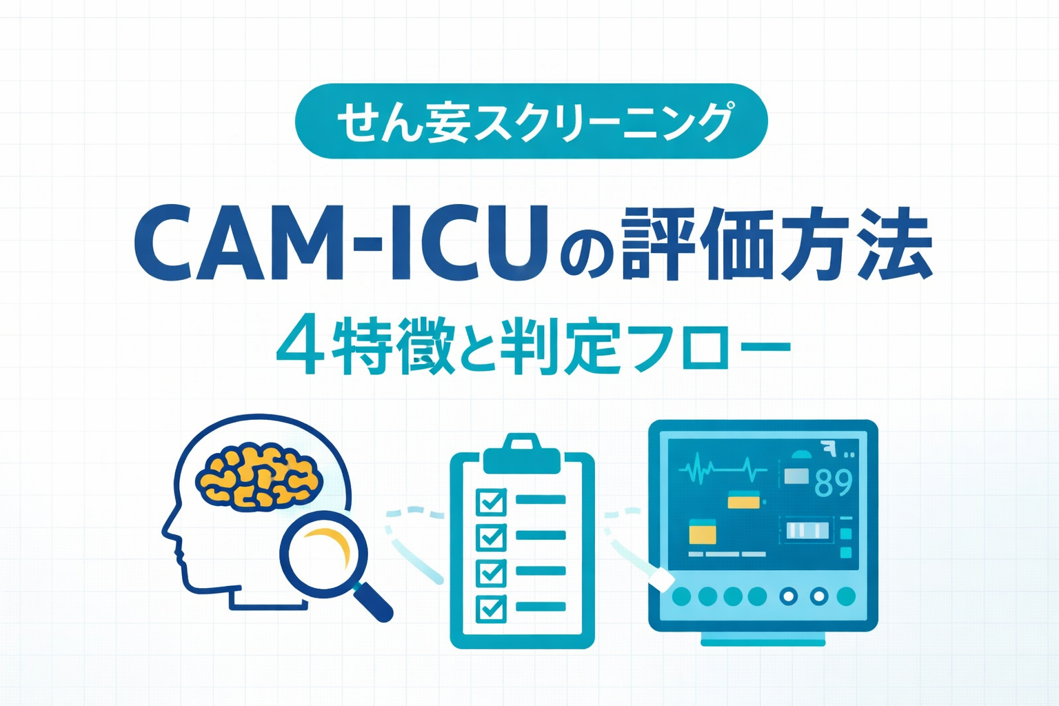 CAM-ICU( Confusion Assessment Method for the ICU )は、ICU 患者のせん妄スクリーニングを短時間で行うための評価ツールです。せん妄は「注意の障害」と「状態の変動」が核になるため、印象だけだと見落としやすいのが難点です。CAM-ICU を同じ手順で反復できるようになると、離床・運動負荷・コミュニケーション介入の安全域を取り戻しやすくなります。 [oai_citation:0‡Society of Critical Care Medicine (SCCM)](https://www.sccm.org/clinical-resources/guidelines/guidelines/guidelines-for-the-prevention-and-management-of-pa?utm_source=chatgpt.com)