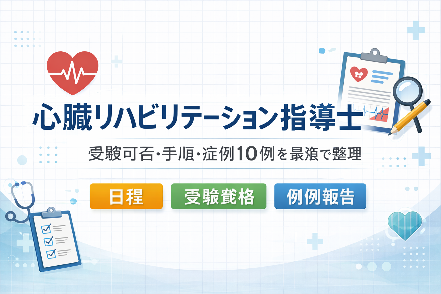 心臓リハビリテーション指導士は、「循環器リハの運用」をチームで回すための共通言語になりやすい資格です。いちばん大事なのは勉強より先に、① 2026 年に受験できるか(会員歴・実地経験・研修制度)と、② 症例報告 10 例と書類を “詰まらず” に揃える運用を確定することです。