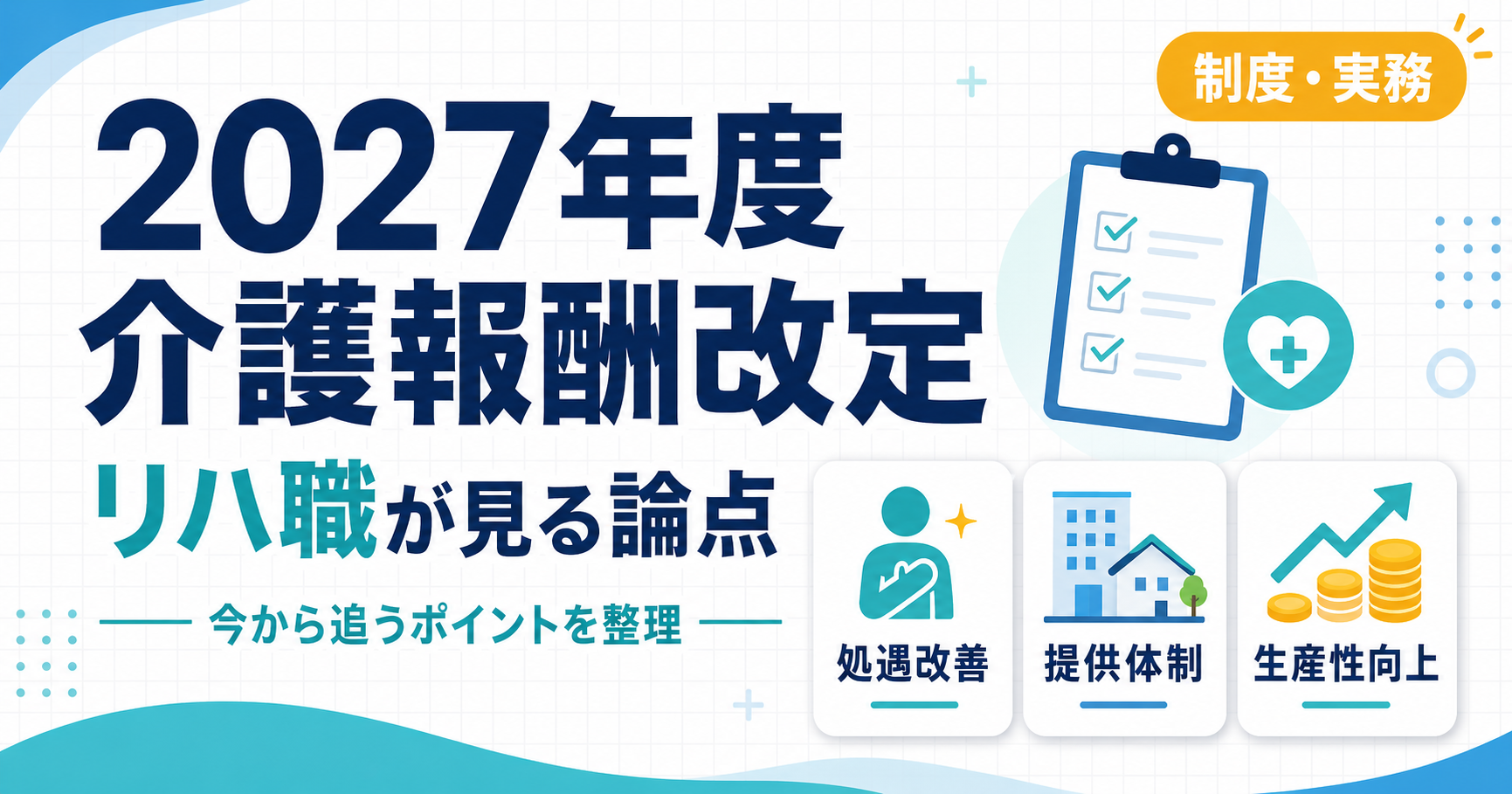 2027 年度介護報酬改定は、まだ具体的な単位数や要件が出ていない段階です。まずは 2026 年 6 月の期中改定や訪問リハの処遇改善の流れを整理し、そのうえで今後の分科会資料を追うと理解しやすくなります。