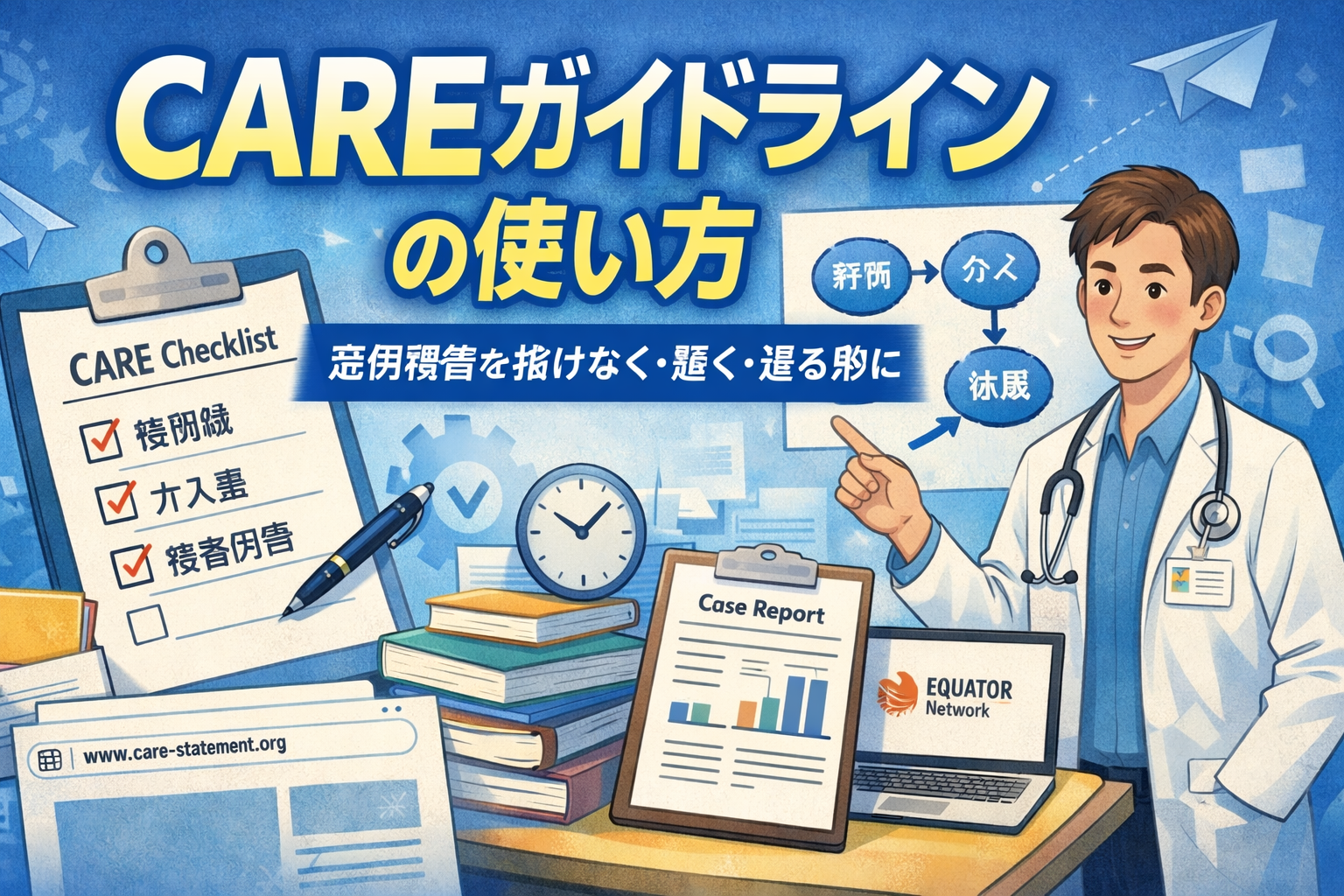 CARE( CAse REport )は、症例報告を読み手が追える形で書くための報告ガイドラインです。臨床の現場では「書きたいことはあるのに、抜け・飛躍・冗長さで通りにくい」ことが起こりがちですが、CARE はそれをチェックリストとして潰すのに向いています。