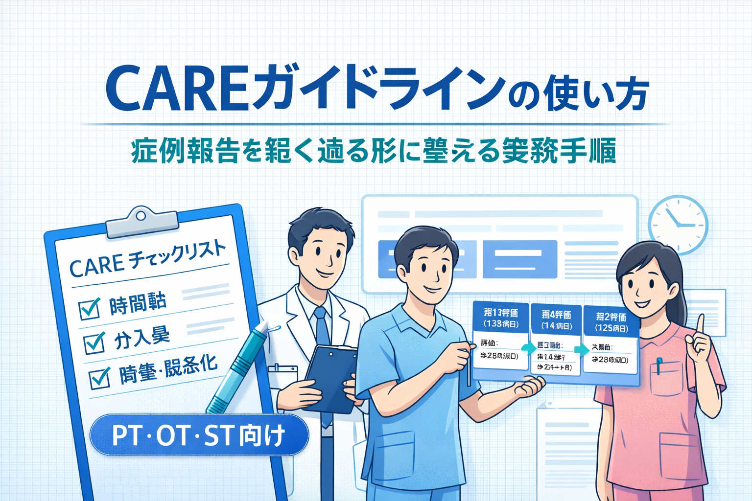 CARE( CAse REport )は、症例報告を読み手が追える形で示すための報告ガイドラインです。通りにくい原稿の多くは、内容不足ではなく、時間軸・介入量・結論のつなぎ方が崩れていることにあります。