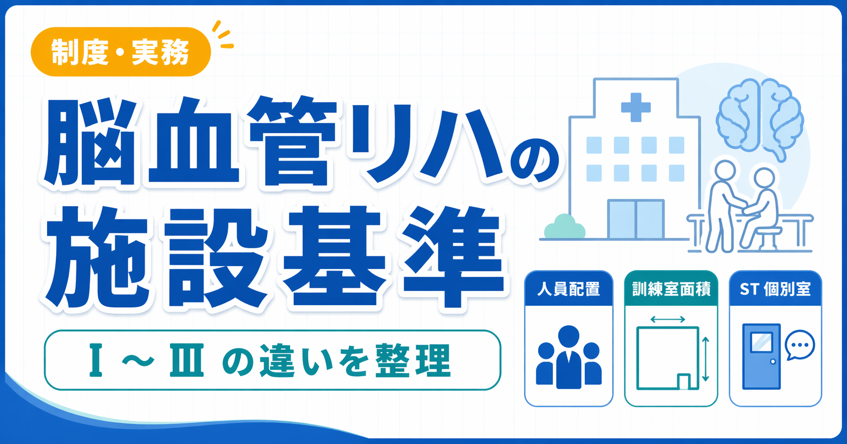 この記事では、脳血管疾患等リハビリテーション料 Ⅰ ・ Ⅱ ・ Ⅲ の違いを、人員配置、専用機能訓練室、 ST 個別療法室、届出様式の視点から整理します。 5 区分全体の位置づけから確認したい場合は、先に 疾患別リハビリテーション料とは? 5 区分・日数・単位 を読むと、 H001 の位置づけがつかみやすくなります。