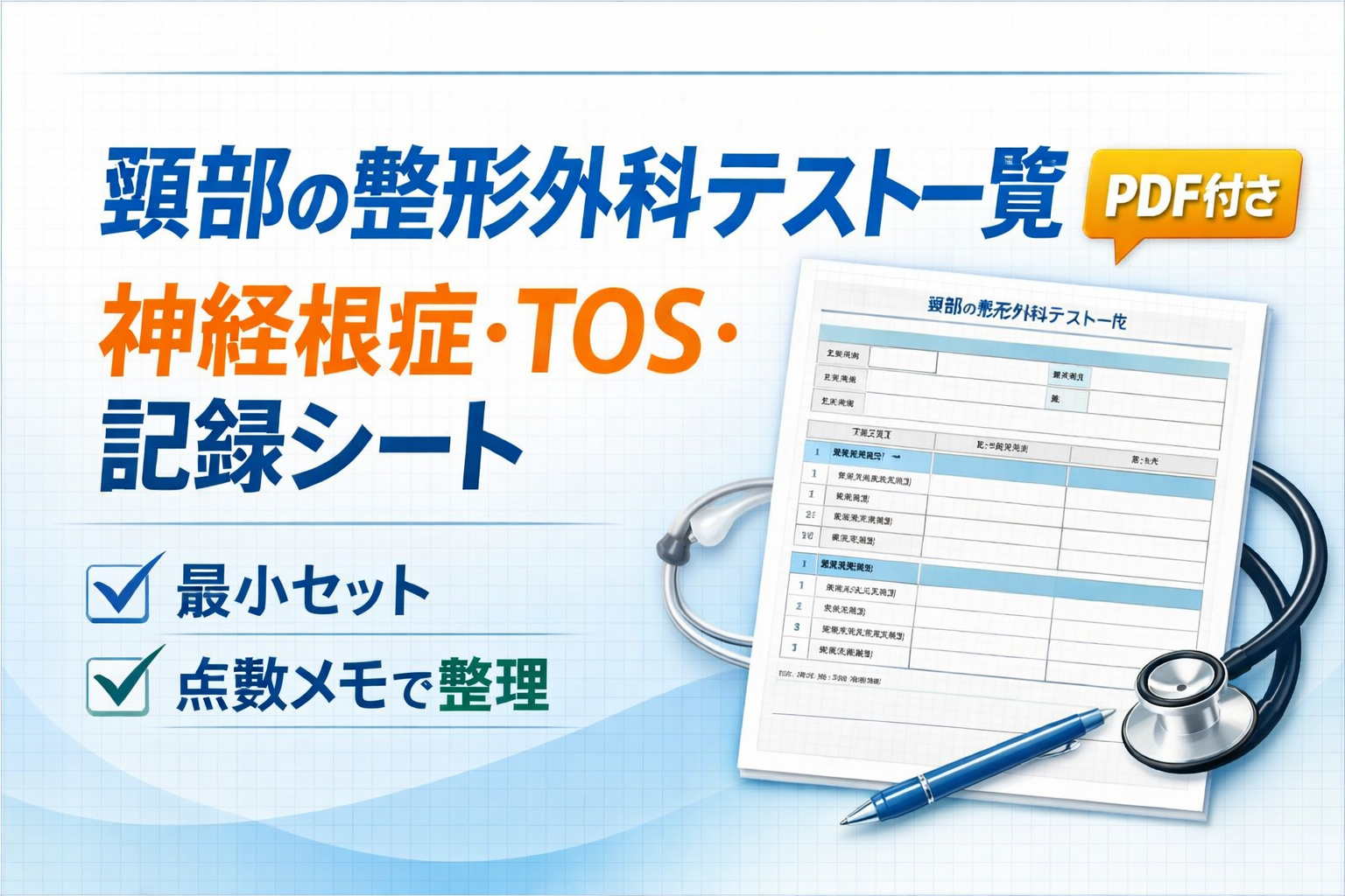 頸部の整形外科テストは、陽性/陰性だけを残しても次の判断につながりにくい評価です。そこで、患者情報・評価条件・採点メモ・再評価メモを 1 枚でそろえられる記録シートを用意しました。最小セットを固定して比較したいときに使いやすい構成です。