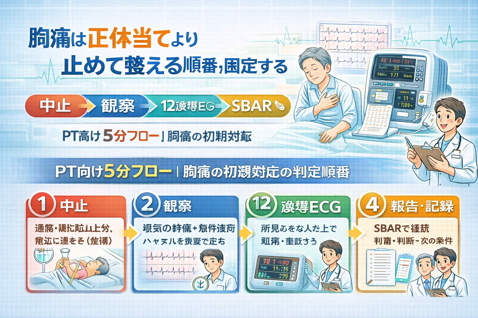 新人が胸痛で迷うのは、鑑別を考えすぎて「いま何をするか」が遅れることです。まずは 中止 → 観察 → 12 誘導 ECG の確認 → SBAR で報告 → 記録の順番を固定すると、見落としと連絡ストレスが減ります。